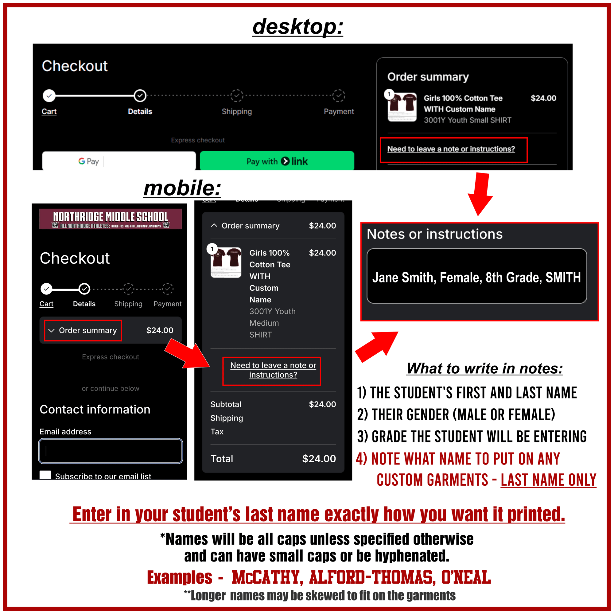 Once items are added to the cart, you will follow the checkout instructions and find this page where you can enter in your student's name.